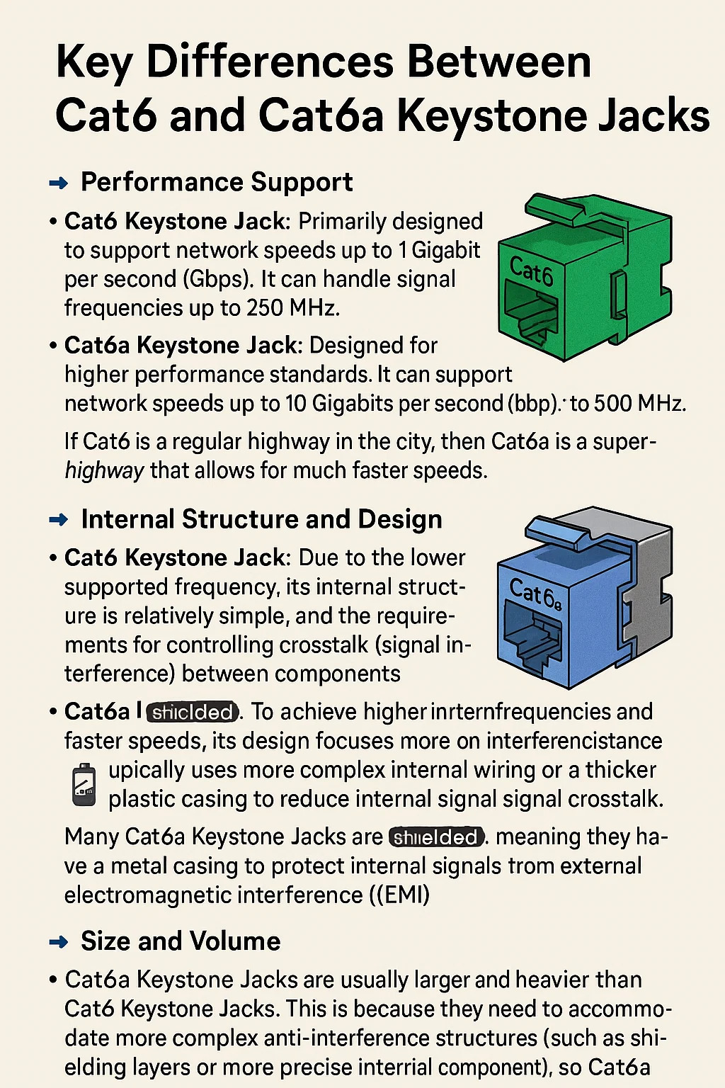• Cat6a Keystone Jacks er vanligvis **større og tyngre** enn Cat6 Keystone Jacks.