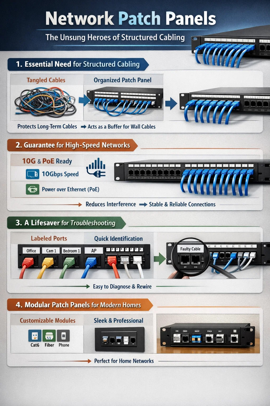 Fra kaotisk til organisert: Uten et nettverkspatchpanel ville dusinvis av nettverkskabler som går fra forskjellige rom se ut som et sammenfiltret rot av "nudler." Patchpanelet organiserer disse kablene pent, og gir hver kabel sin egen utpekte plassering.