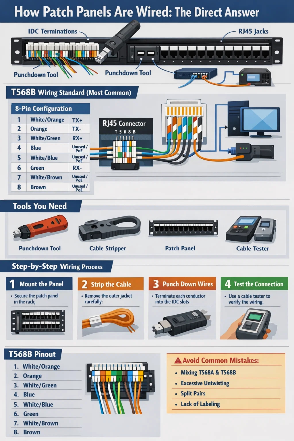 Hele formålet med et patchpanel i et nettverksrack er å fungere som et fast, organisert termineringspunkt for horisontale kabelføringer, holde infrastrukturen din ren og gjøre bevegelser, tilføyelser og endringer enkle uten å forstyrre den permanente kablingen bak veggene. De fleste profesjonelle installasjoner bruker T568B som standard ledningsstandard , selv om T568A kreves for offentlige bygninger under visse standarder. Det som betyr mest er konsistens – bland aldri standarder i samme serie.