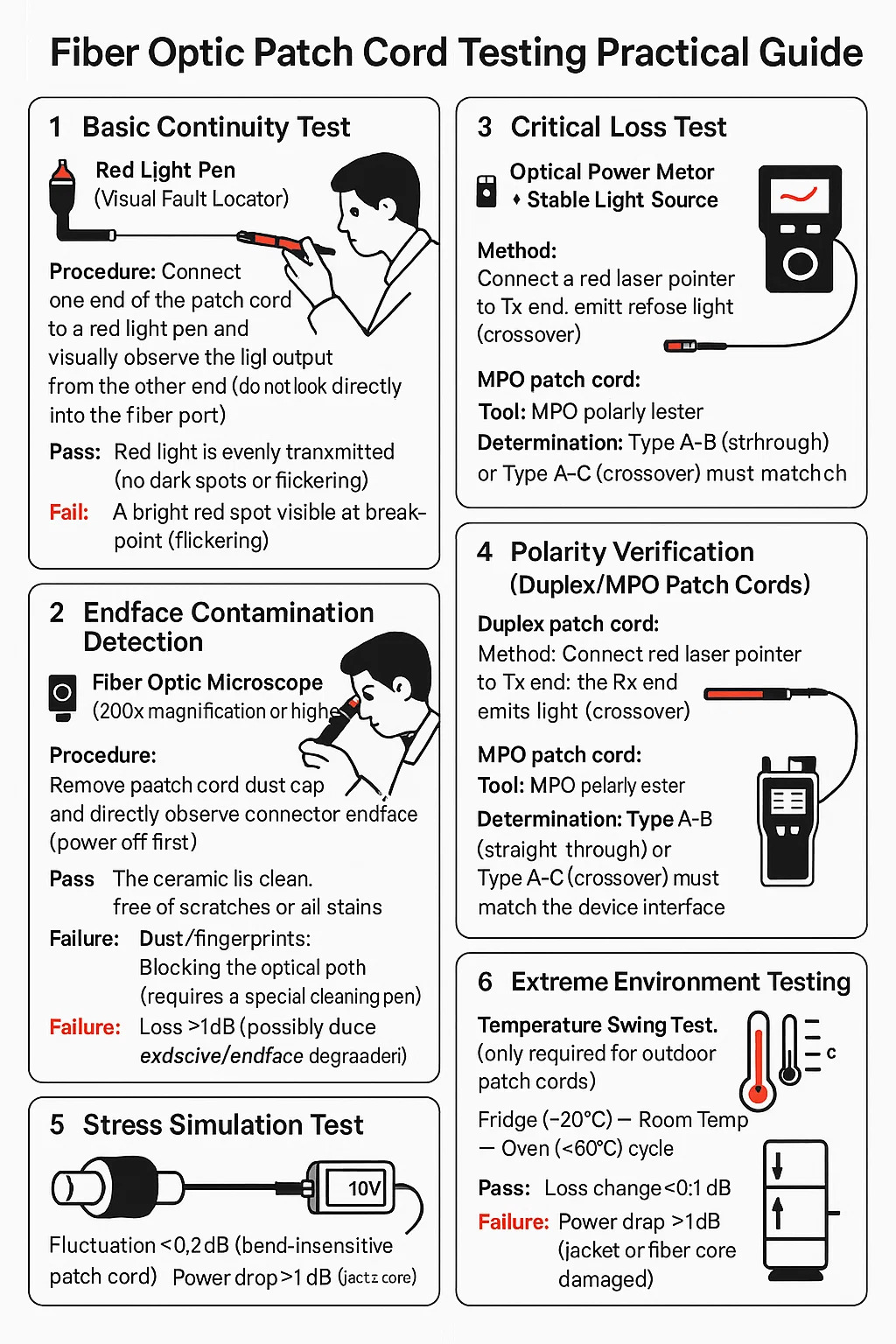 PASS: Svingninger ≤0,2dB (bøy-ufølsom lappledning). Feil: Strømdråpe> 1DB (jakke eller fiberkjerne skadet).