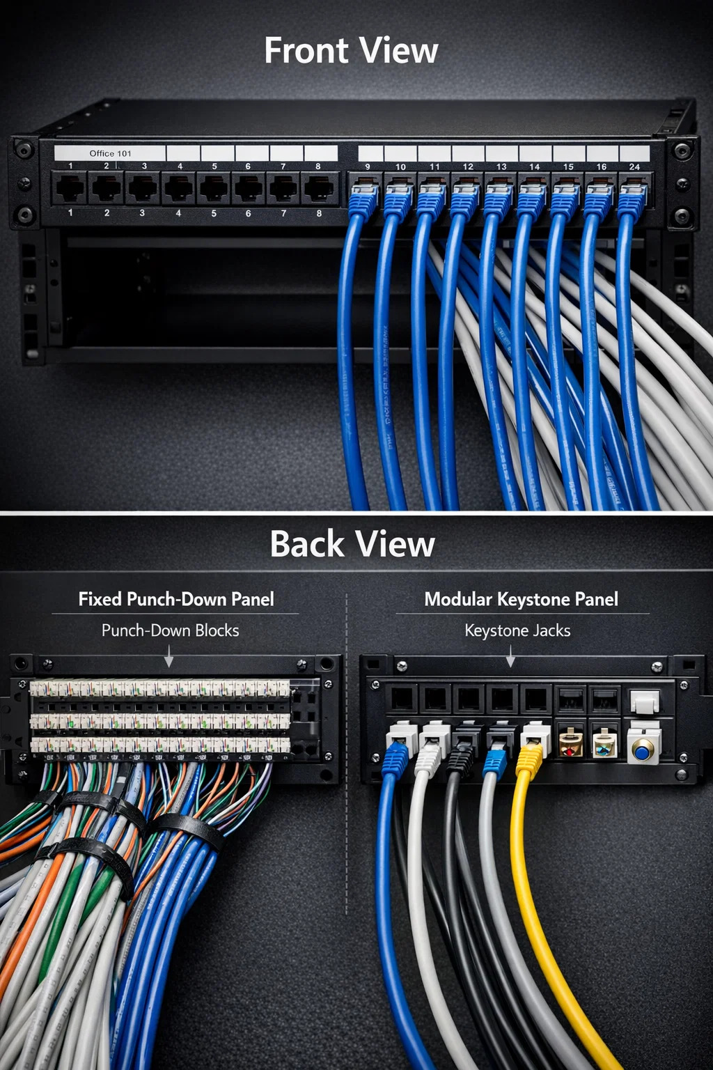 For å forstå den visuelle identiteten til en nettverkspatchpanel , er det nyttig å dele den ned i sine to forskjellige sider: den brukervendte fronten og infrastrukturen som vender bak.