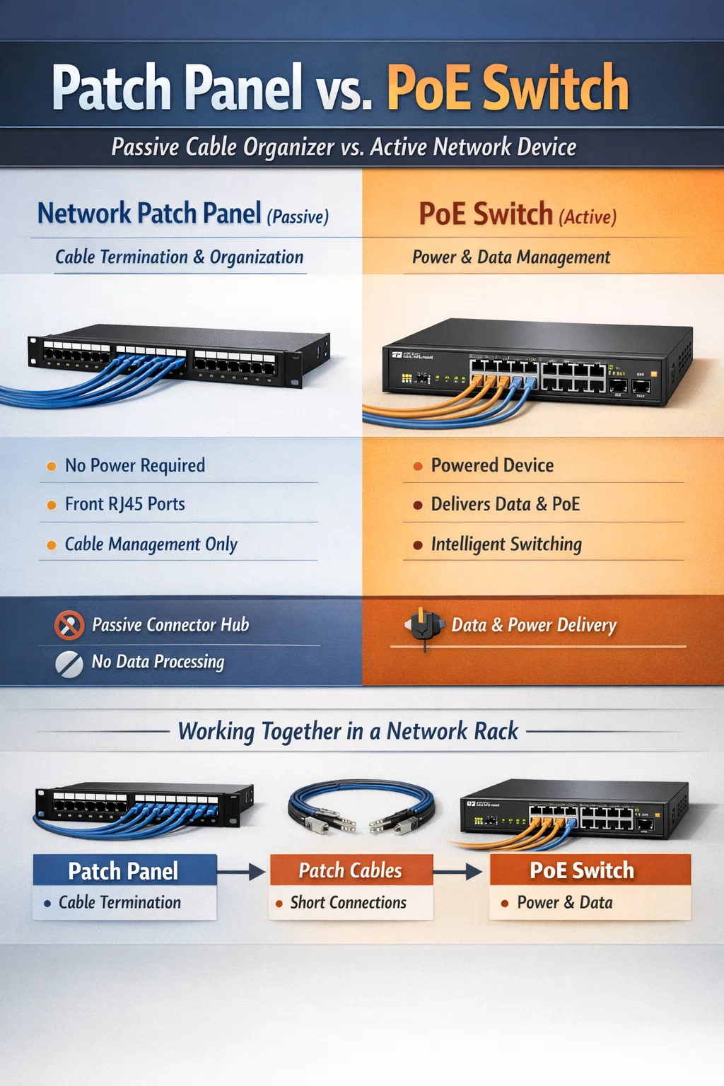 Den primære forskjellen ligger i deres grunnleggende natur: a nettverkspatchpanel er en passiv maskinvarekomponent som brukes for kabelorganisering og terminering, mens en PoE-bryter er en aktiv elektronisk enhet som styrer datatrafikk og leverer elektrisk strøm over Ethernet-kabler. Et patchpanel krever ikke strøm og kan ikke behandle data; en PoE-svitsj krever en strømkilde og fungerer som "hjernen" i det lokale nettverket.