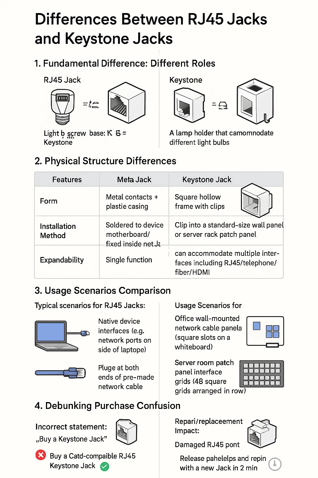 Keystone Jack: En modulær monteringsramme. Det er ikke selve grensesnittet, men en firkantet plastbase som brukes til å sikre RJ45 Jacks (eller andre grensesnitt). Den kan klippes inn i veggpaneler eller patchpaneler som byggeklosser.