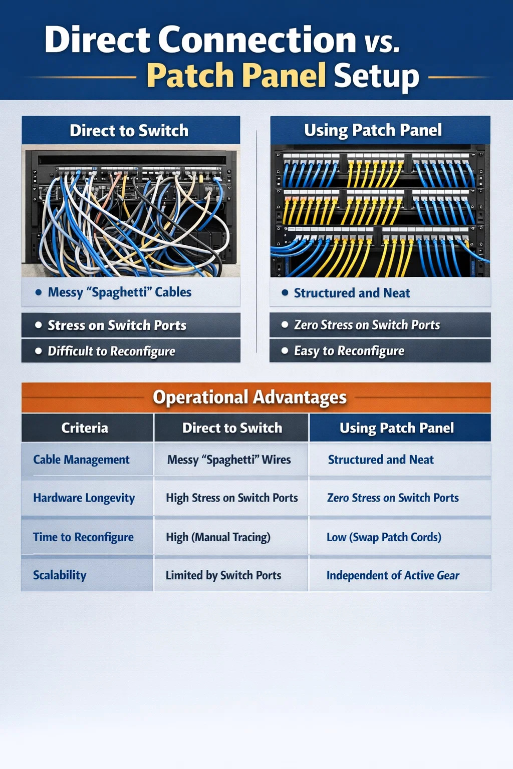 Nettverksteknologien utvikler seg raskt. I dag bruker du kanskje en 1Gbps-svitsj, men om tre år vil du kanskje oppgradere til en 10Gbps PoE-svitsj for avanserte Wi-Fi 7-tilgangspunkter. Hvis kablene dine er direkte koblet til den gamle bryteren, innebærer oppgraderingen å koble fra alt og risikere kabelskade.