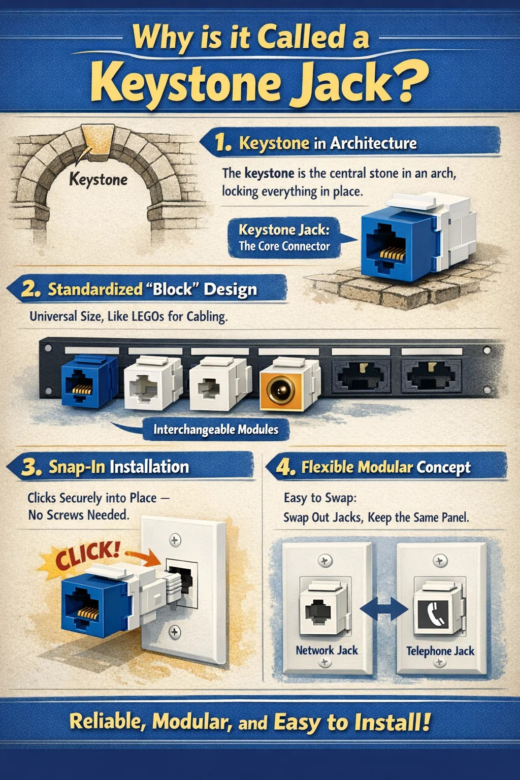 Grunnen til at denne nettverkskontakten kalles en Keystone Jack er på grunn av en meget passende analogi knyttet til design og installasjonsmetode.